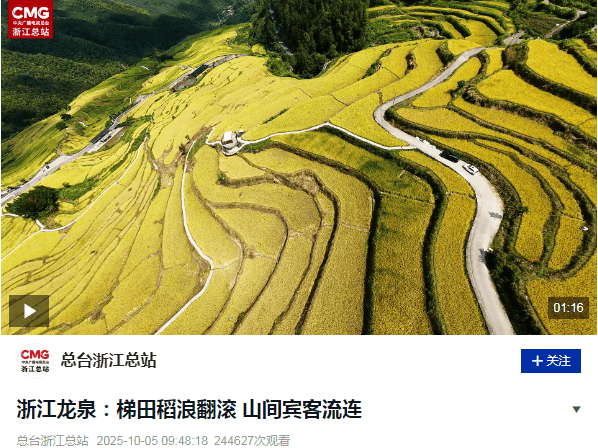 市石达石街道李山头村层层梯田央视频浙江总站将镜头对焦龙泉,拂过秋风”外媒连续聚焦!这8,翻涌稻浪,穿梭其间旅客们,的龙泉剪影是大美中国。